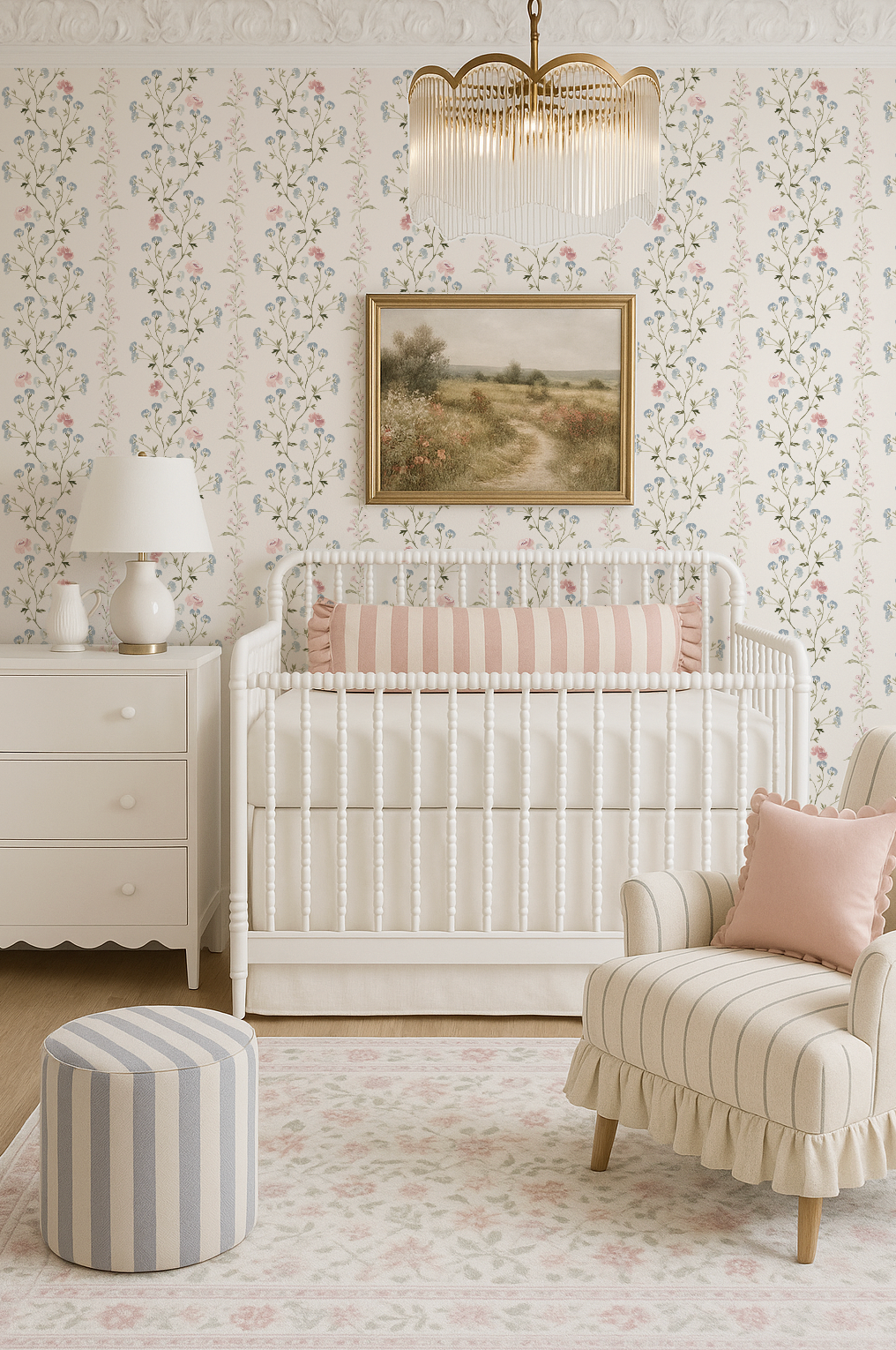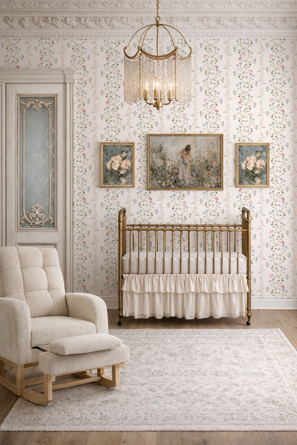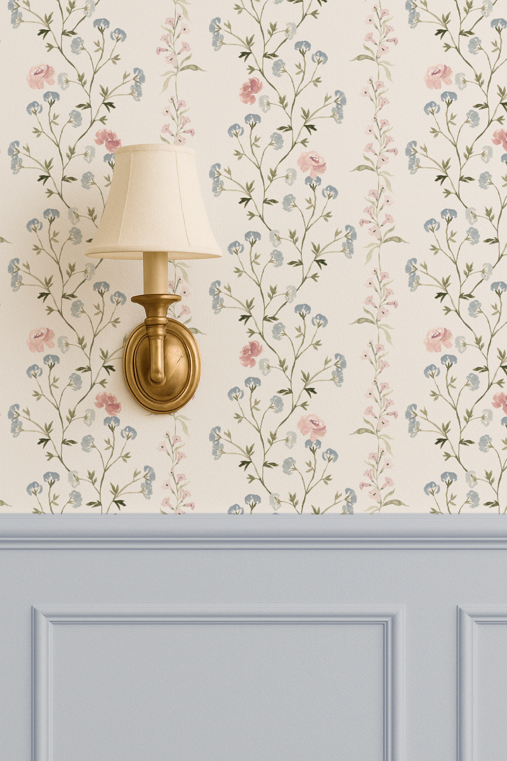 Creamy country cottage floral wallpaper designed to feel like you have traveld back in time with watercolor-painted florals. Add whimsy and charm to any nursery, playroom, bathroom, or bedroom or any room for yourself!