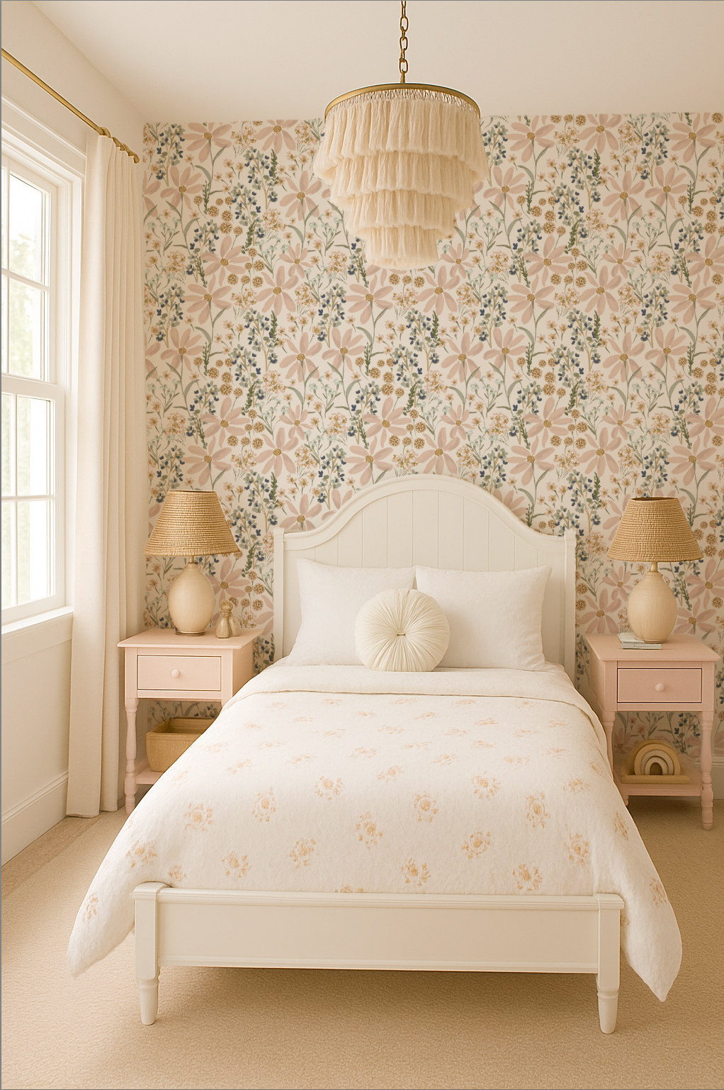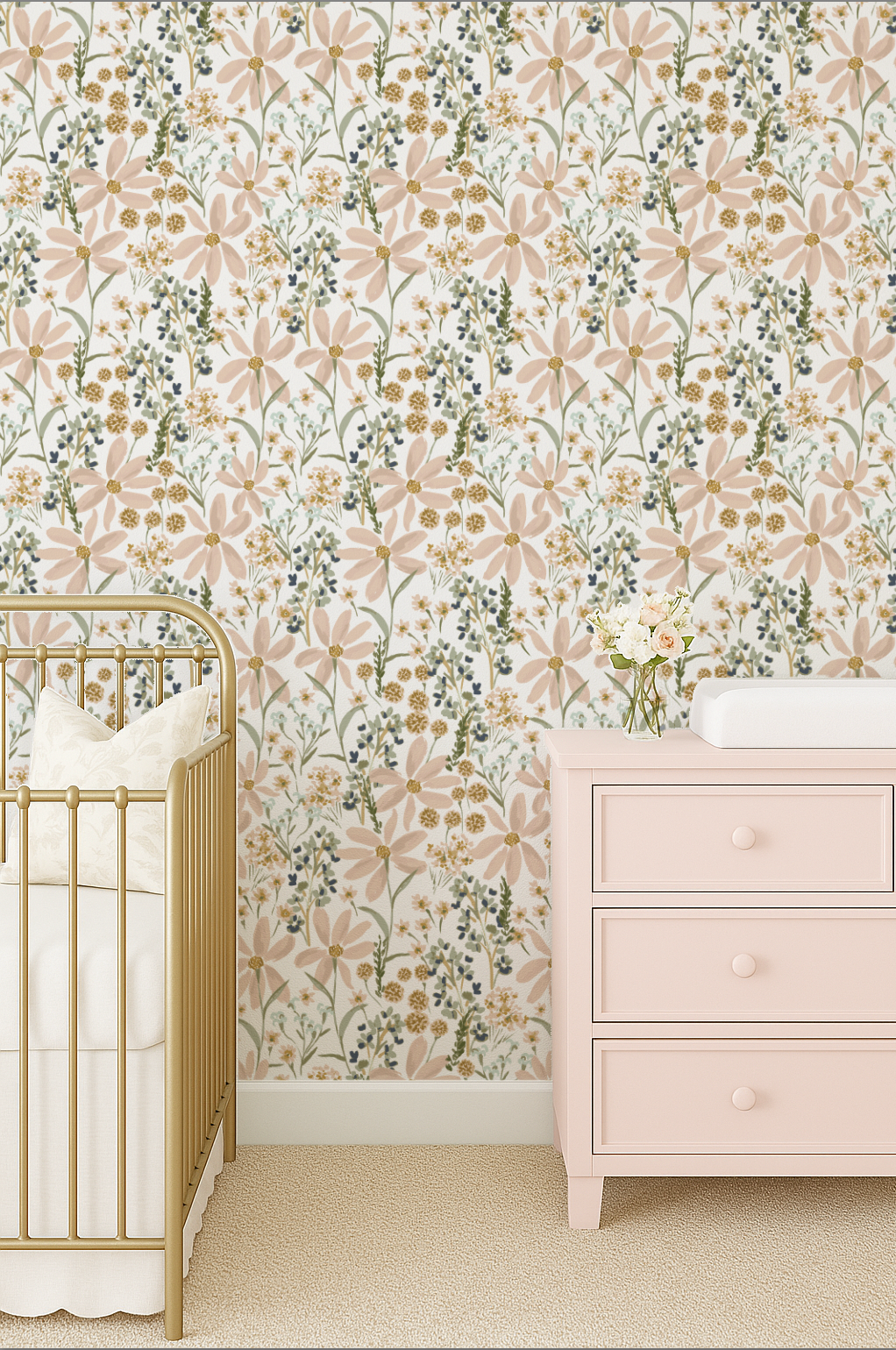 Turn your little girl’s room into a dream room with best-selling Daisy Dreams, our hand-painted wallpaper designed to feel like a custom mural, without the cost of hiring an artist. Soft muted pinks, navy, sage green, yellows, on a white background. Add whimsy and charm to any nursery, playroom, bathroom, or bedroom or any room for yourself!