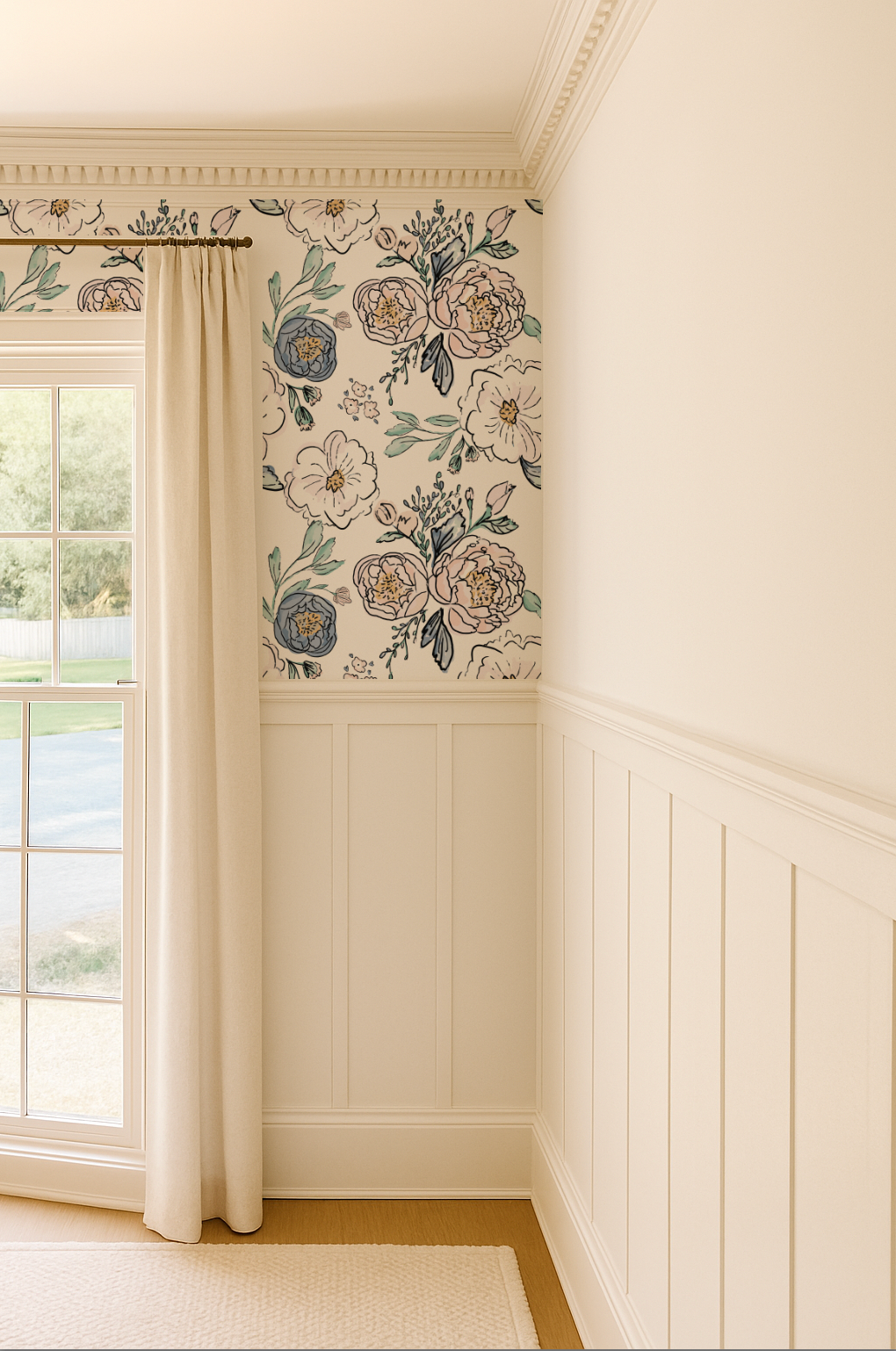 Crafted to look like it was painted directly onto your wall, this peel-and-stick or traditional LUXE pasted wallpaper adds artistic beauty and a touch of luxury to any space. Designed by artist Mindy Young of Indy Bloom Design™, each floral element is brushed with heart and joy from her Utah farm studio.