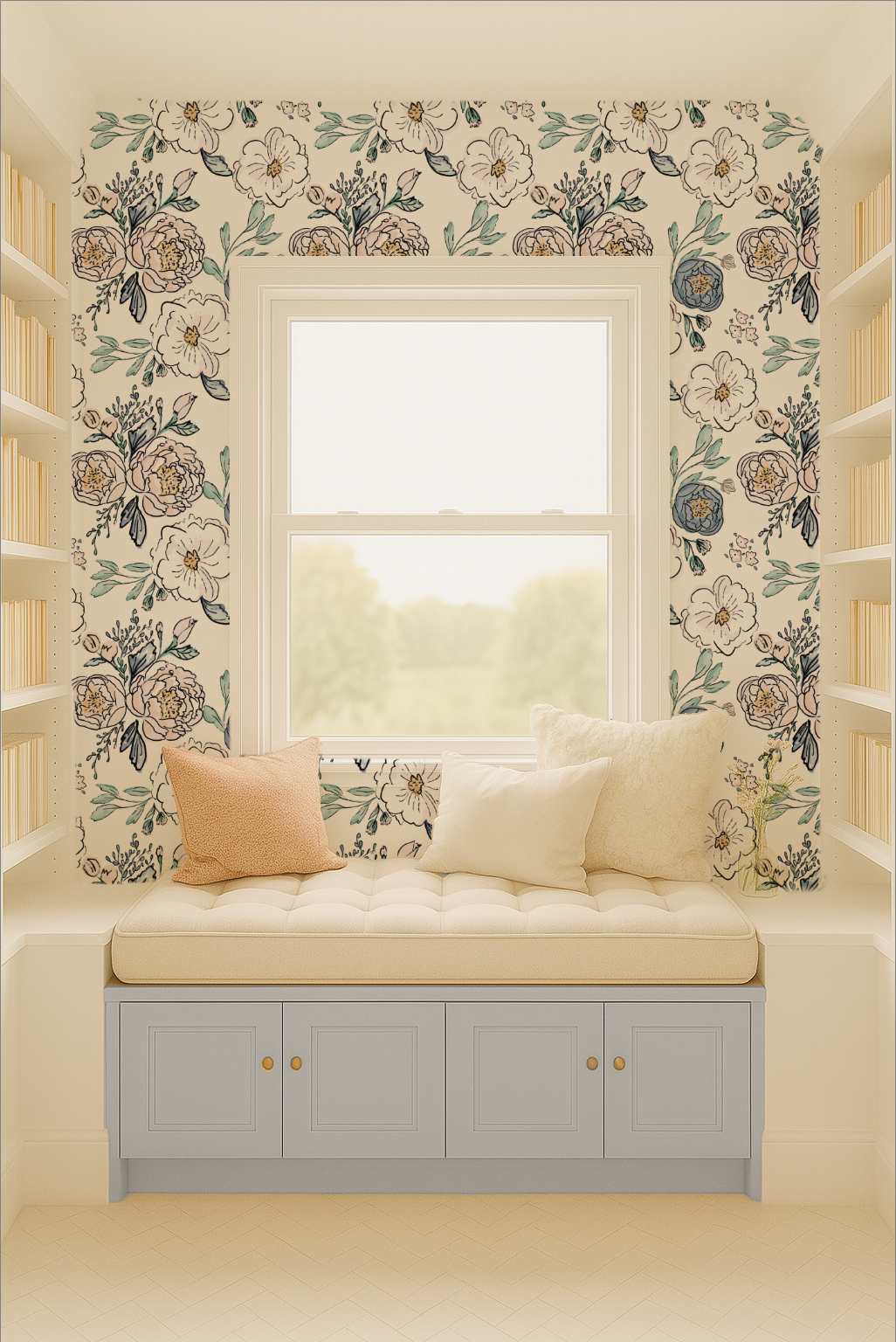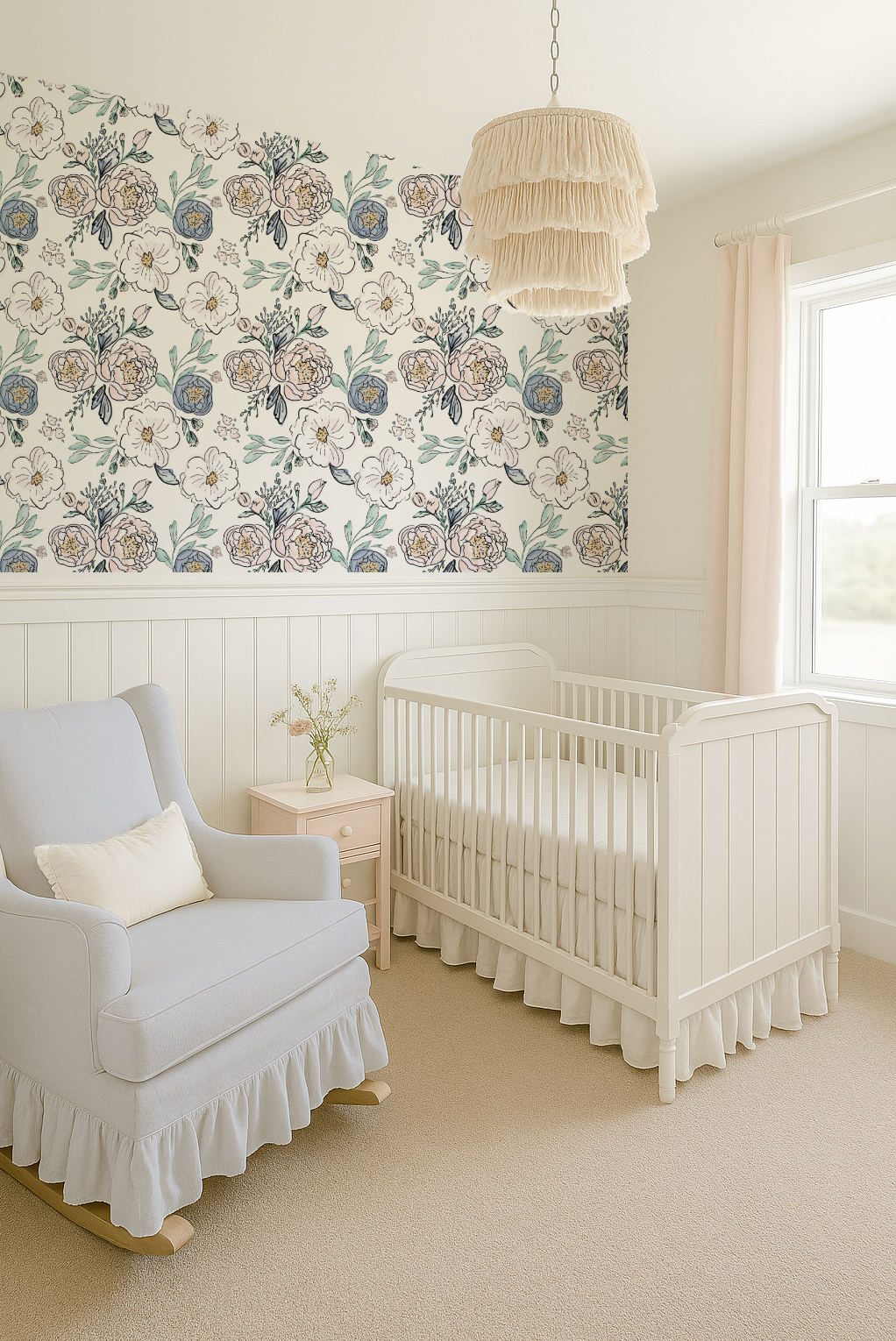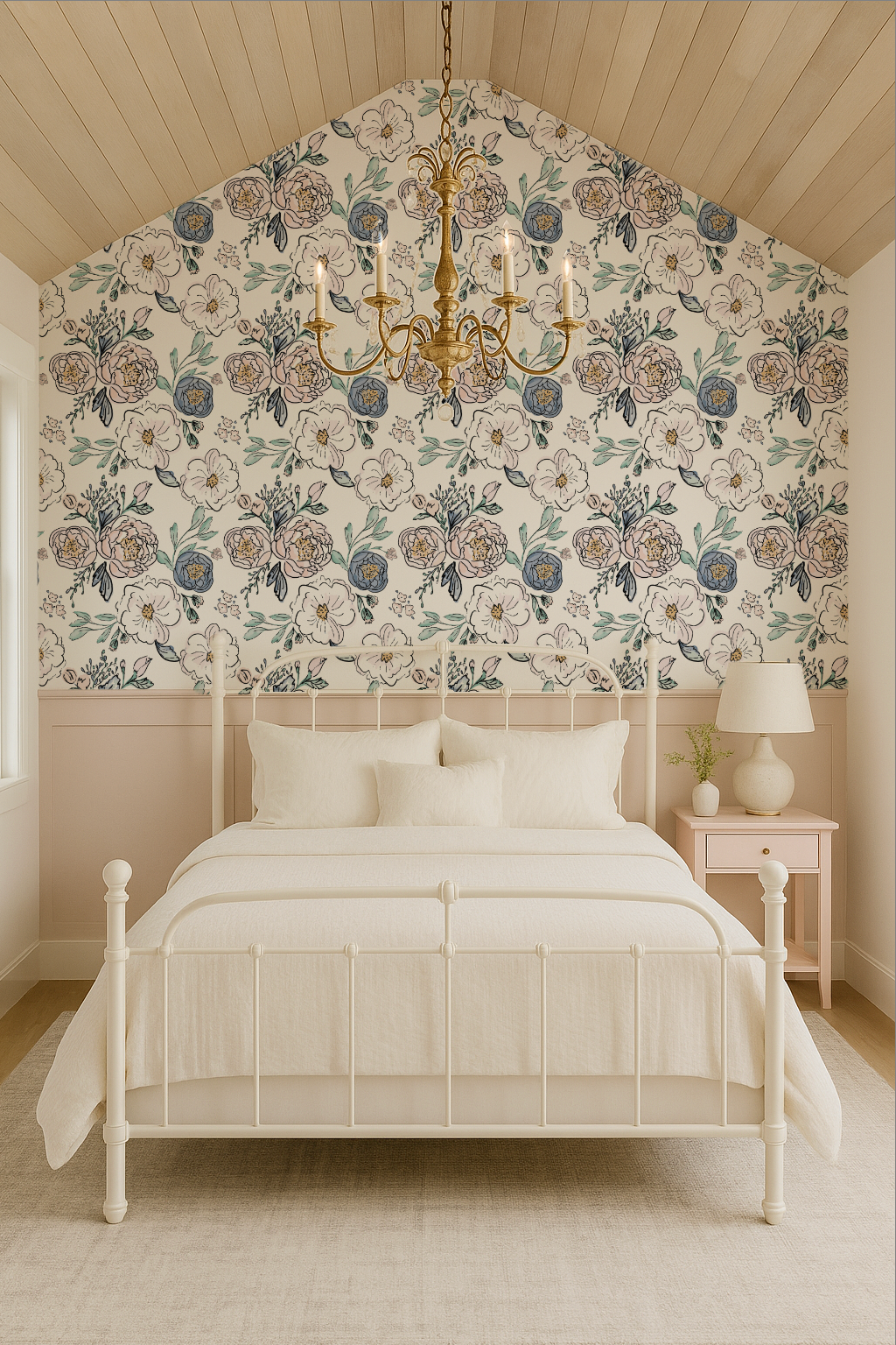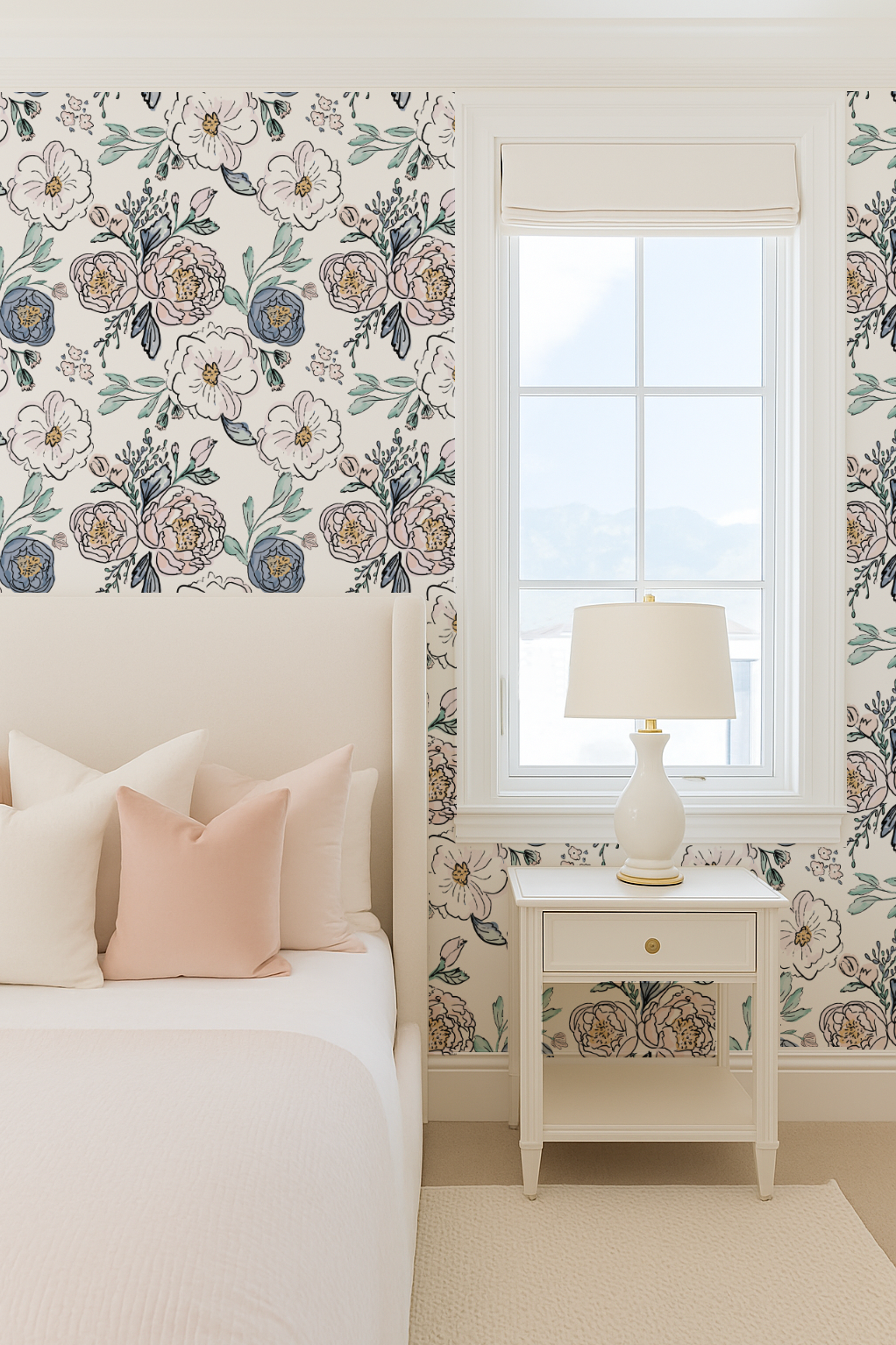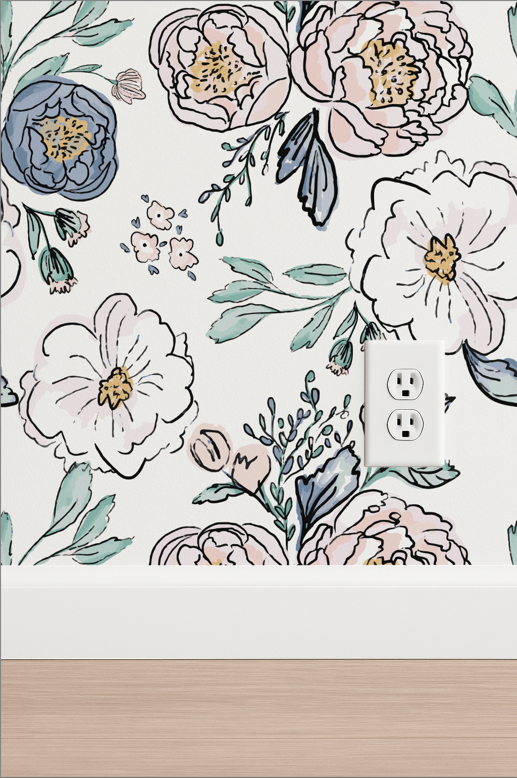 Turn your little girl’s room into a floral dream. Our hand-painted wallpaper is designed to feel like a custom mural, without the cost of hiring an artist. Soft muted pinks, blues and teals, on a white background. Add whimsy and charm to any nursery, playroom, bathroom, or bedroom or any room for yourself!