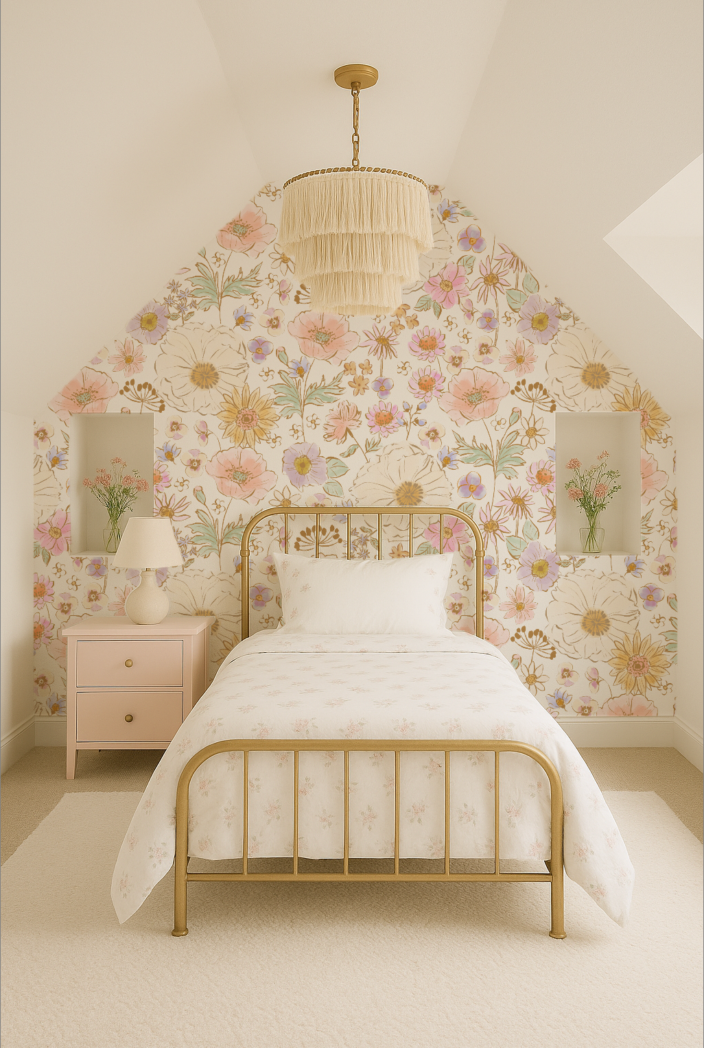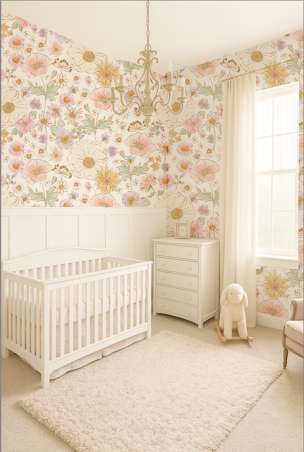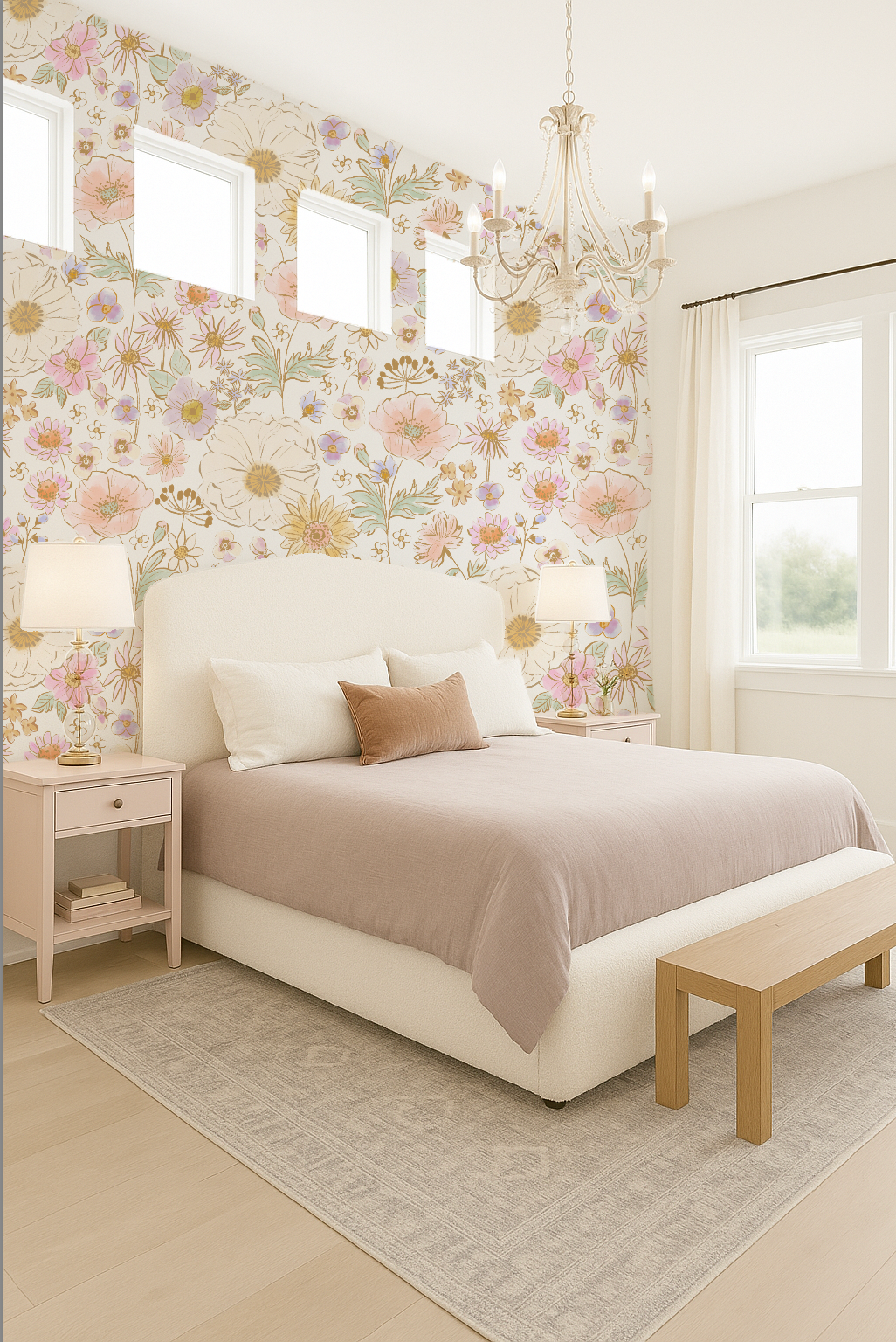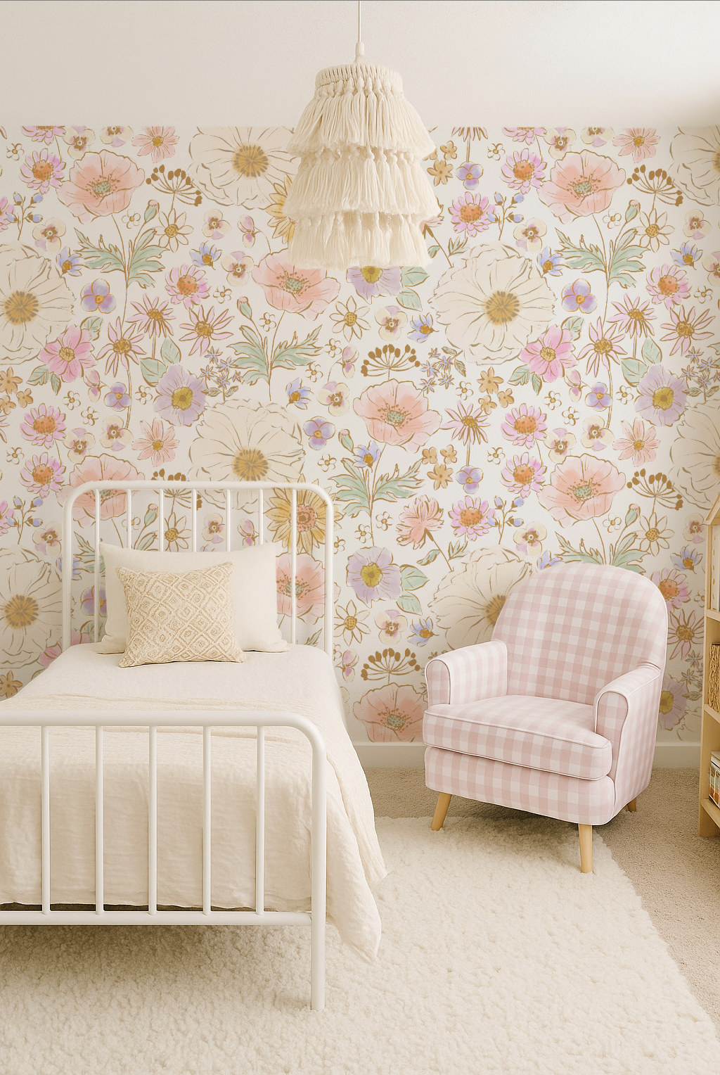 Turn your little girl’s room into a dreamy floral oasis with Posy Pansie Party, our hand-painted watercolor floral wallpaper designed to feel like a custom mural—without the cost of hiring an artist. Soft pinks, purples, golden tones, teals, and creamy brown line work, on a white background. Add whimsy and charm to any nursery, playroom, bathroom, or bedroom or any room for yourself!