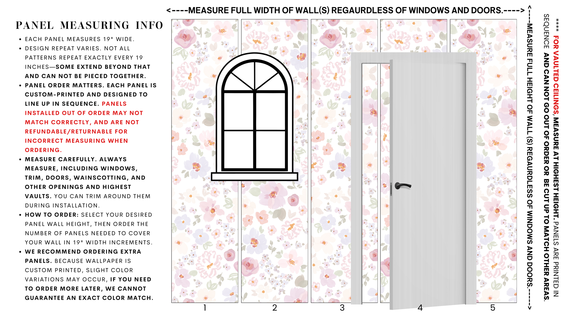 Important: Panels of varying heights cannot be combined, as the patterns will not align properly. We do not refund or take returns on improperly measured spaces, as your order is custom printed.