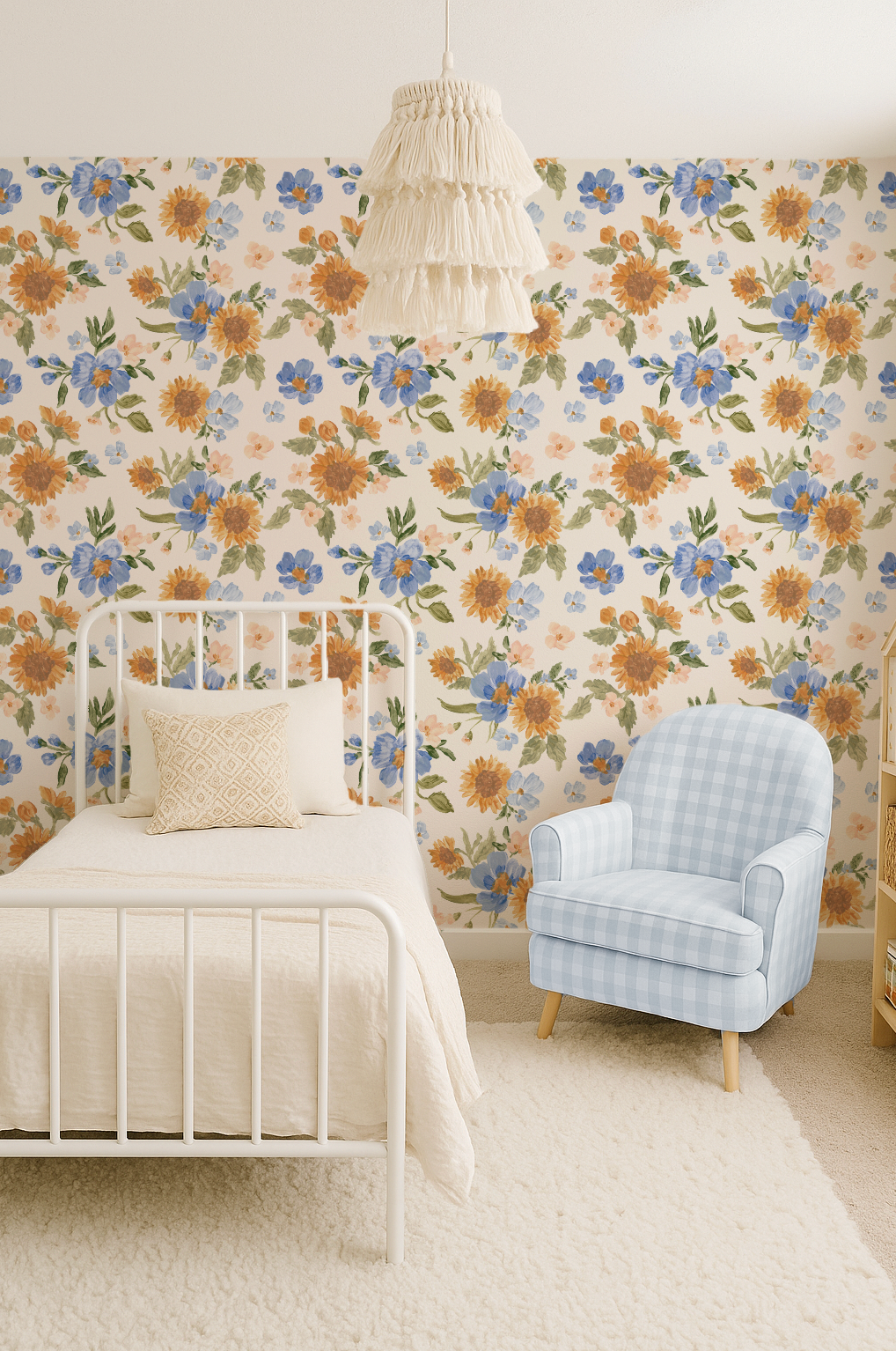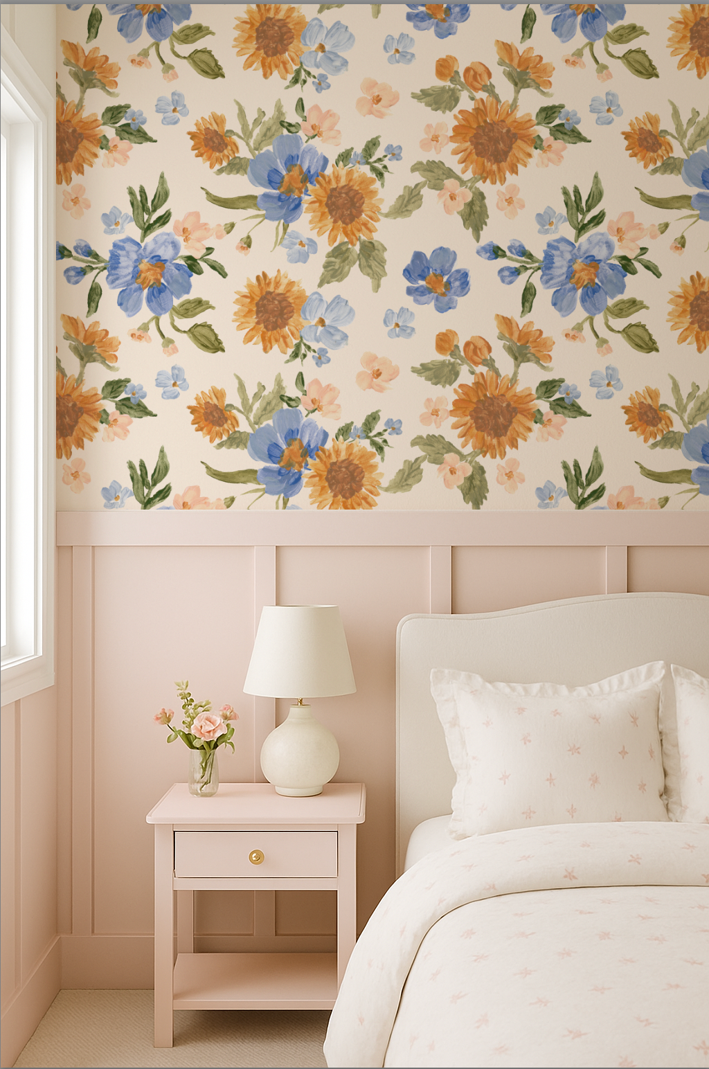 Turn your little girl’s room into a floral garden dream! Our hand-painted wallpaper is designed to feel like a custom mural, without the cost of hiring an artist. This design comes with Soft muted pinks, creams, golden yellow, pretty blues, on an off white background. Add whimsy and charm to any nursery, playroom, bathroom, or bedroom or any room for yourself!