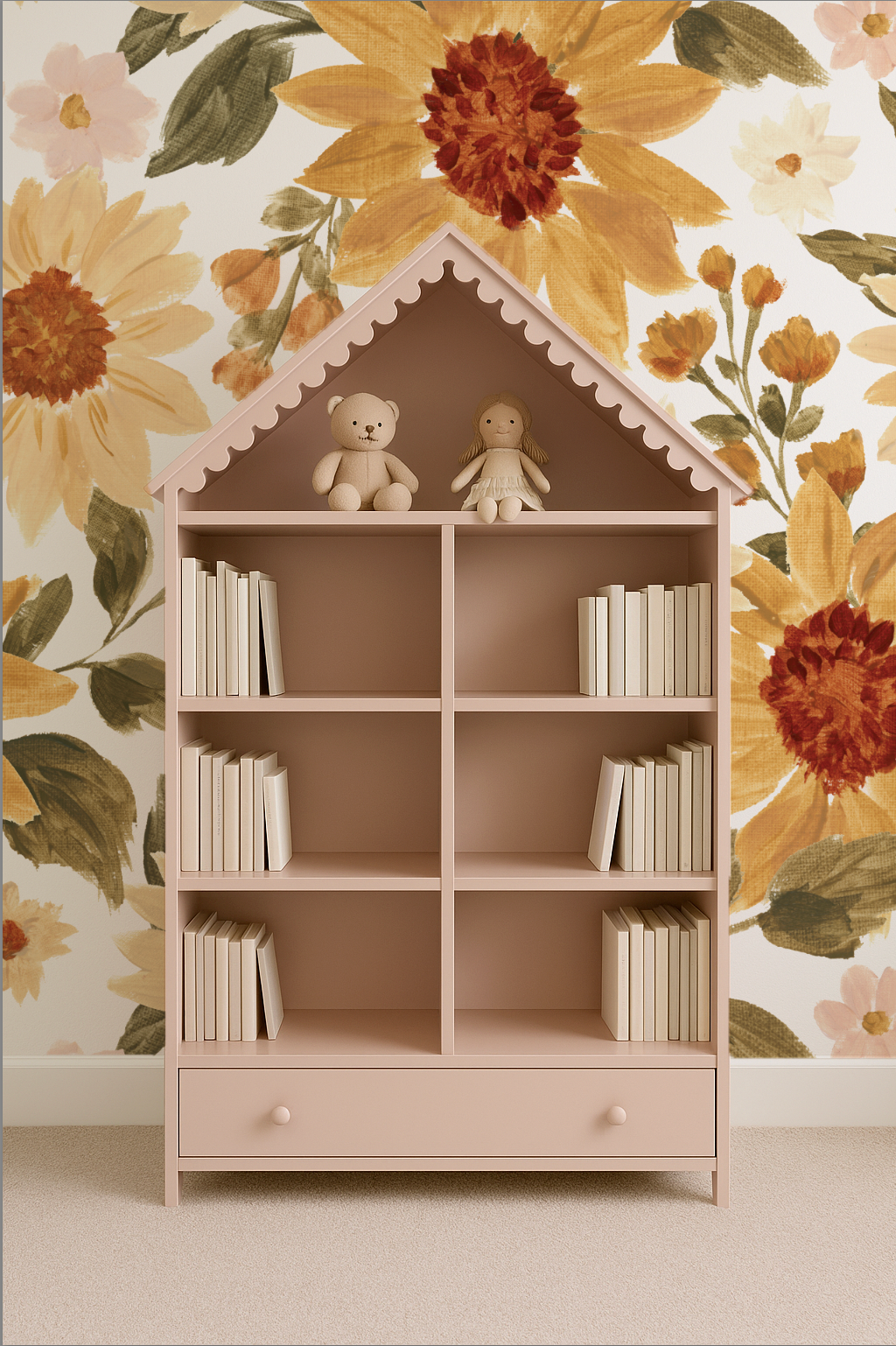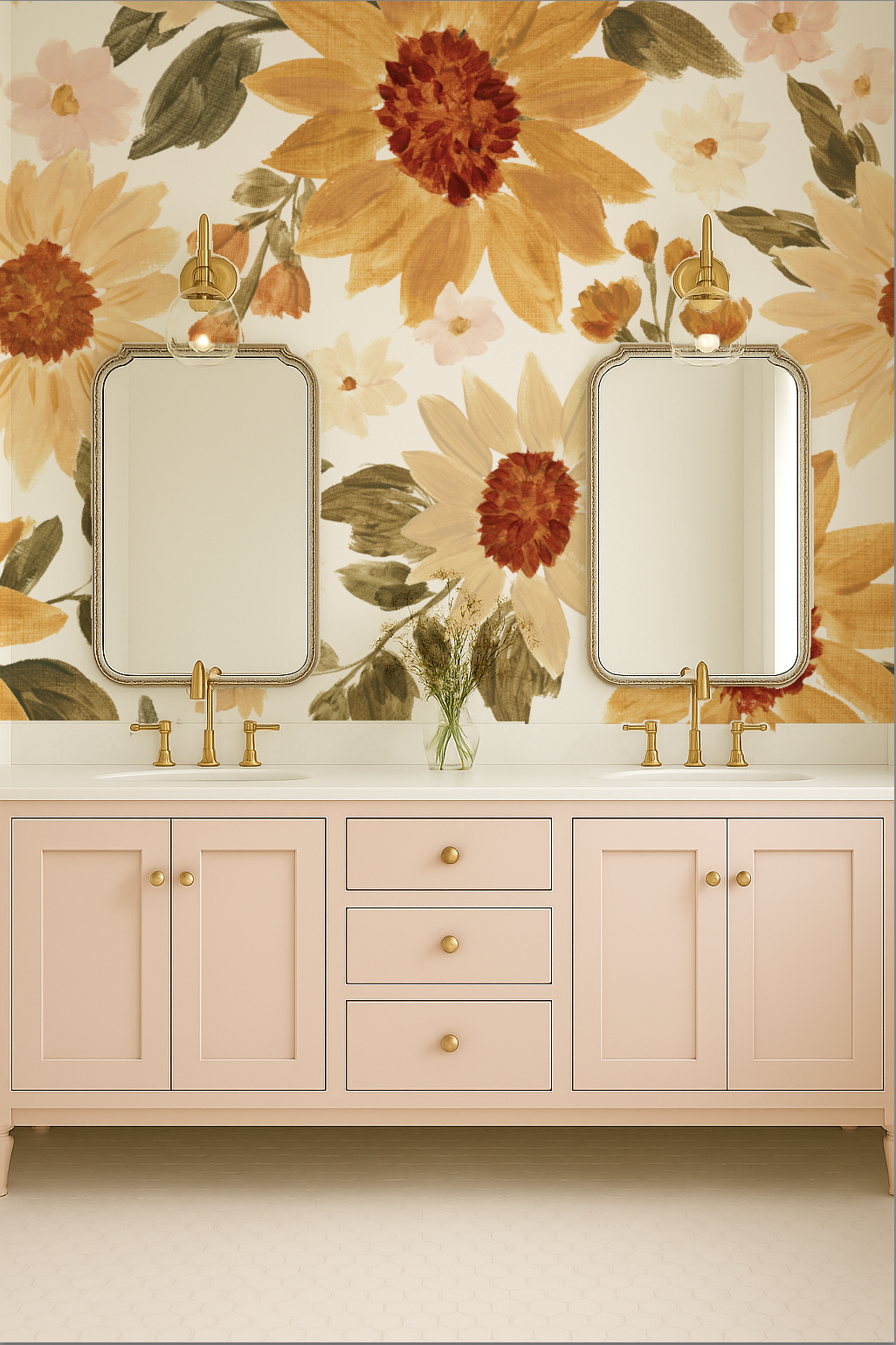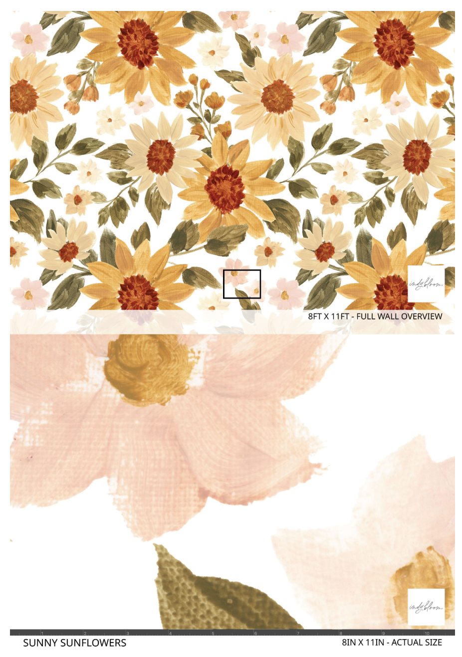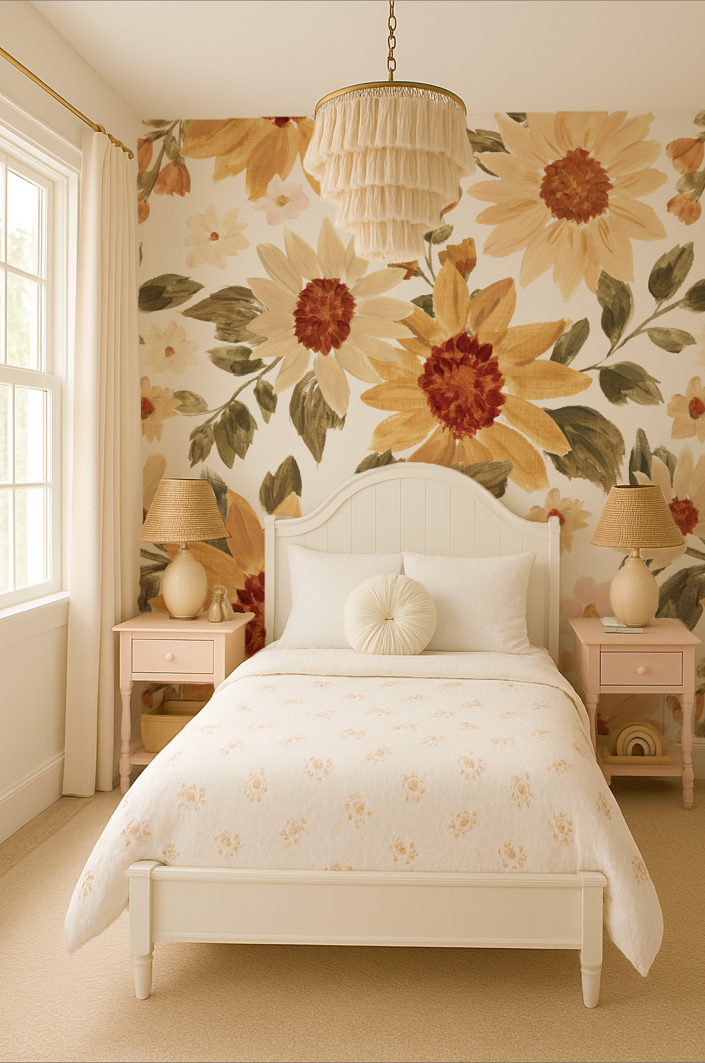 Turn your little girl’s room into a boho sunflower dream room, our hand-painted wallpaper is designed to feel like a custom mural, without the cost of hiring an artist. Soft muted pinks, creams, and golden yellows, on a white background. Add whimsy and charm to any nursery, playroom, bathroom, or bedroom or any room for yourself!