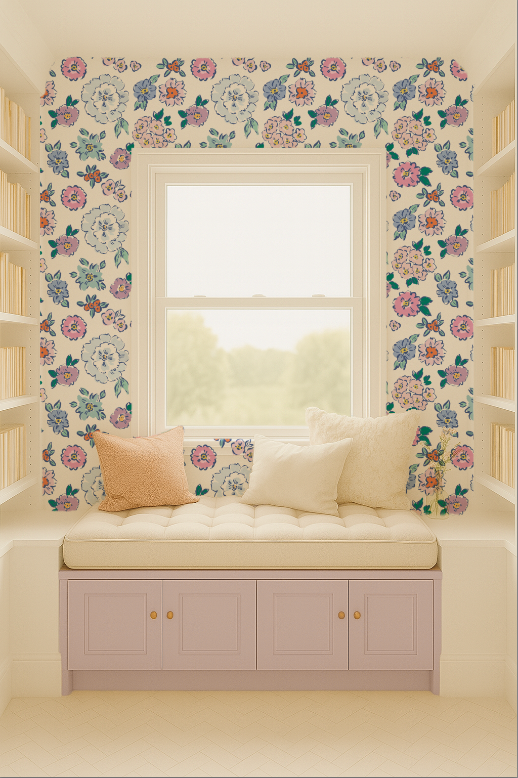 Turn your little girl’s room into a floral garden dream! Our hand-painted wallpaper is designed to feel like a custom mural, without the cost of hiring an artist. This design comes in pastel blues, pinks, purples, on a white background. Add whimsy and charm to any nursery, playroom, bathroom, or bedroom or any room for yourself!