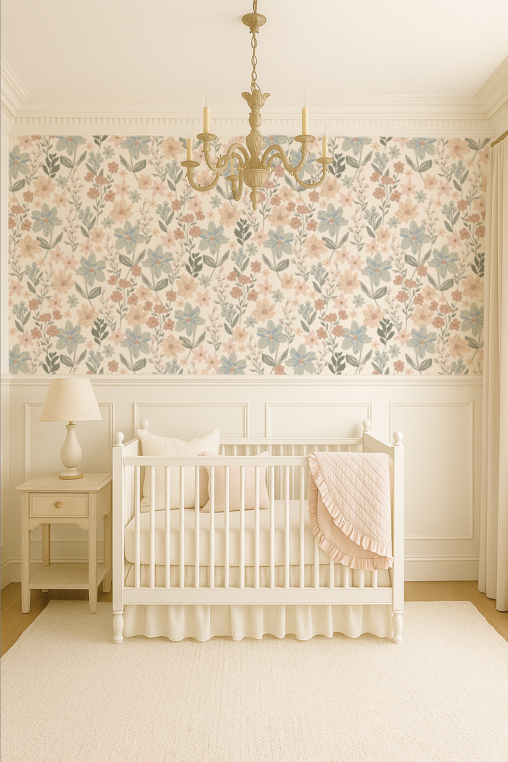 Turn your little girl’s room into a vintage floral dream! Our hand-painted wallpaper is designed to feel like a custom mural, without the cost of hiring an artist. Soft muted pinks, creams, greens, and soft blues, on an off white background. Add whimsy and charm to any nursery, playroom, bathroom, or bedroom or any room for yourself!